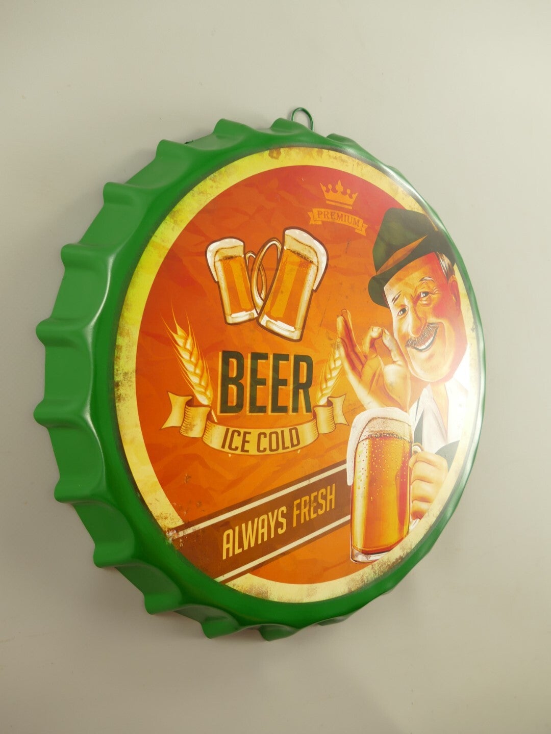 Beer ice cold metalen wandbord in vorm van een dop , leuk voor de mancave.